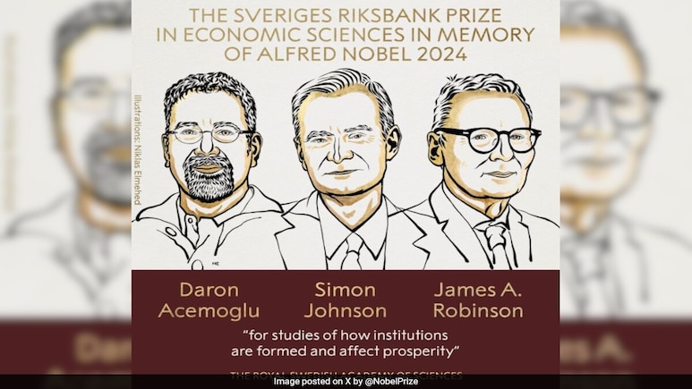 रॉयल स्वीडिश एकेडमी ऑफ साइंसेज (Royal Swedish Academy of Sciences) ने सोमवार को अर्थशास्त्र के नोबेल पुरस्कार (Nobel Prize) की घोषणा की है. इस बार पुरस्कार के लिए अमेरिकी शिक्षाविद्डेरोन एसेमोग्लू (Daron Acemoglu),साइमन जॉनसन (Simon Johnson) और जेम्स रॉबिन्सन (James Robinson) को चुना गया है.इस बार अर्थशास्त्र का नोबेल पुरस्कार विभिन्न देशों में खुशहाली के अंतर के संबंध में शोध के लिए दिया जाएगा.