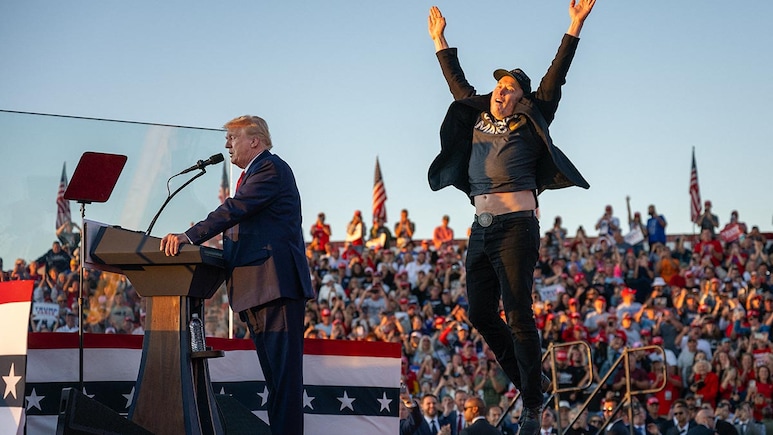 डोनाल्ड ट्रंप की सभा में उछलते हुए एलन मस्क.