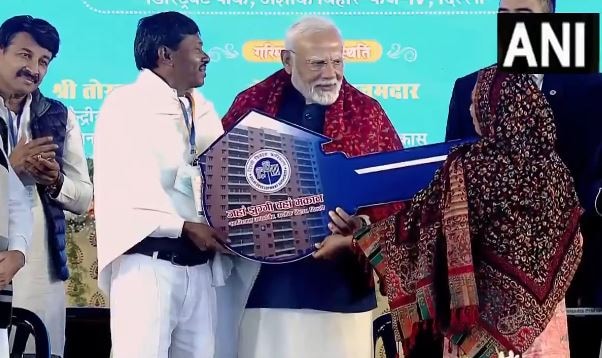 पीएम मोदी लाभार्थियों को फ्लैट की चाबी सौंपते हुए