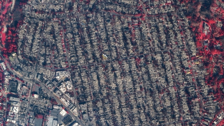 लॉस एंजिलिस की आग इतनी विकराल रूप ले चुकी है कि ये स्पेस से भी दिखने लगी है. NASA ने इसकी तस्वीरें जारी की हैं. आसमान से जो नज़ारा दिख रहा है,वो डरावना है. सड़कों पर जहां-तहां जले हुए ट्रक नज़र आ रहे हैं. हेलिकॉप्टर पानी गिराकरआग बुझाने की कोशिश में लगे हैं.