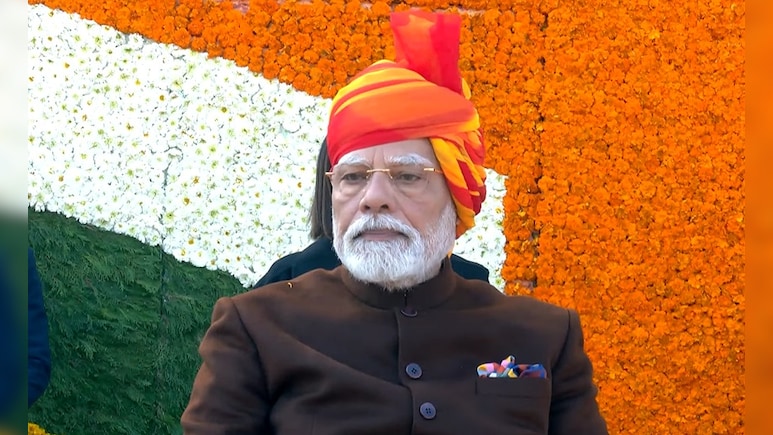 प्रधानमंत्री नरेंद्र मोदी ने रविवार को 76वें गणतंत्र दिवस पर एक बार फिर अपने नए रंग के साफे के साथ नजर आएं. बता दें कि पीएम मोदी हर साल अलग तरह के रंग-बिरंगे साफे में नजर आते हैं और इस बार भी उन्होंने इस परंपरा को बरकरार रखा. पीएम मोदी इस मौके परसफेद कुर्ता-पायजामा के साथ गहरे भूरे रंग का बंद गले का कोट और लाल-पीले रंग का साफा पहना तथा विशिष्ट अवसरों पर चमकीला व रंग-बिरंगा साफा पहनने की अपनी परंपरा को जारी रखा. इससे पहले,प्रधानमंत्री मोदी ने 75वें गणतंत्र दिवस के अवसर पर बहुरंगी 'बांधनी' प्रिंट का साफा पहना था.