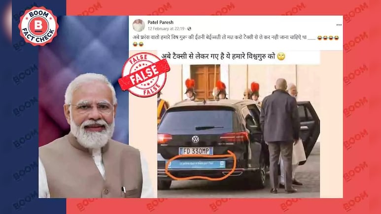 सोशल मीडिया पर एक एडिटेड तस्वीर इस दावे से वायरल है कि फ्रांस दौरे के दौरान प्रधानमंत्री नरेंद्र मोदी को टैक्सी से यात्रा करनी पड़ी. बूम ने अपनी जांच में पाया कि पीएम मोदी के अपमान के दावे से वायरल तस्वीर एडिटेड है. यह तस्वीर 31 अक्टूबर 2021 को पीएम मोदी के वेटिकन सिटी दौरे की है,जहां उन्होंने कैथोलिक ईसाईयों के सर्वोच्च धर्मगुरु पोप फ्रांसिस से मुलाकात की थी. वायरल तस्वीर में FD 330 MP नंबर वाली वोक्सवैगन कंपनी की कार से पीएम मोदी को उतरते देखा जा सकता है. उनके साथ एक सुरक्षा अधिकारी भी मौजूद है. तस्वीर में स्विस गार्ड भी नजर आ रहे हैं.