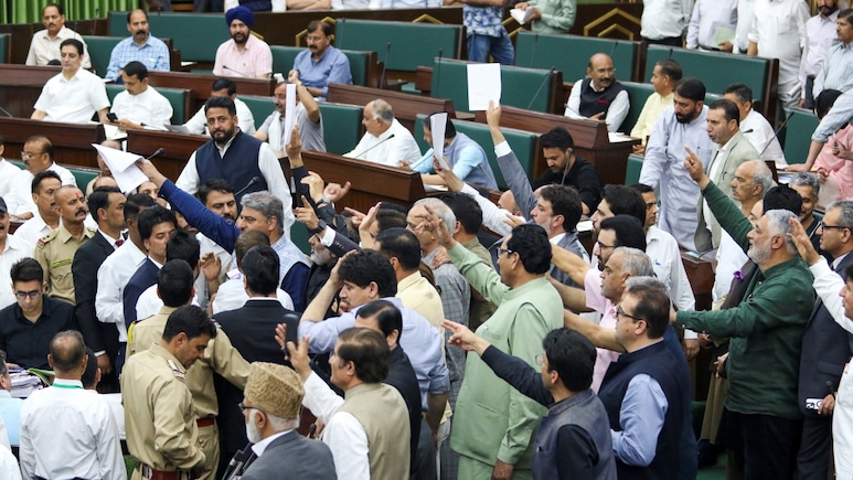 जम्मू कश्मीर विधानसभा में सोमवार जमकर हंगामा देखने को मिला,नेशनल कॉन्फ्रेंस द्वारा वक्फ कानून को लेकर पेश किए गए स्थगन प्रस्ताव पर भारतीय जनता पार्टी (BJP) और सत्ताधारी दल के विधायक आपस में भिड़ गए. भारी शोर-शराबे और नारेबाजी के बीच विधानसभा अध्यक्ष ने सदन की कार्यवाही स्थगित करनी पड़ी.